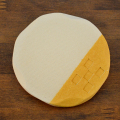 ミンサーの模様が彫りこまれた陶器のコースター。陶器のため水を吸収し、裏側までしみ込んで机を濡らすこともありません。