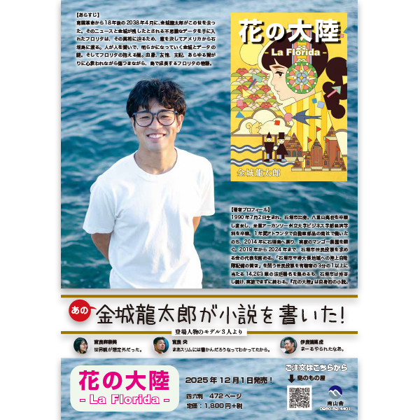 【あらすじ】 南国革命から18年後の2038年4月に、金城龍太郎がこの世を去っ た。そのニュースと金城が残したとされる不思議なデータを手に入 れたフロリタは、その真相に迫るため、意を決してアメリカから石 垣島に渡る。人が人を繋いで、明らかになっていく金城とデータの 謎。そしてフロリタの抱える闇。血縁、友情、支配、あらゆる繋が りに心救われながら傷つきながら、島で成長するフロリタの物語。