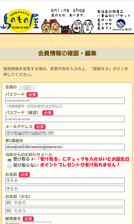 3.当店からのお知らせメールを「受け取る」にチェックを入れないと、お誕生日ポイントプレゼントが受け取れません。ご注意ください。